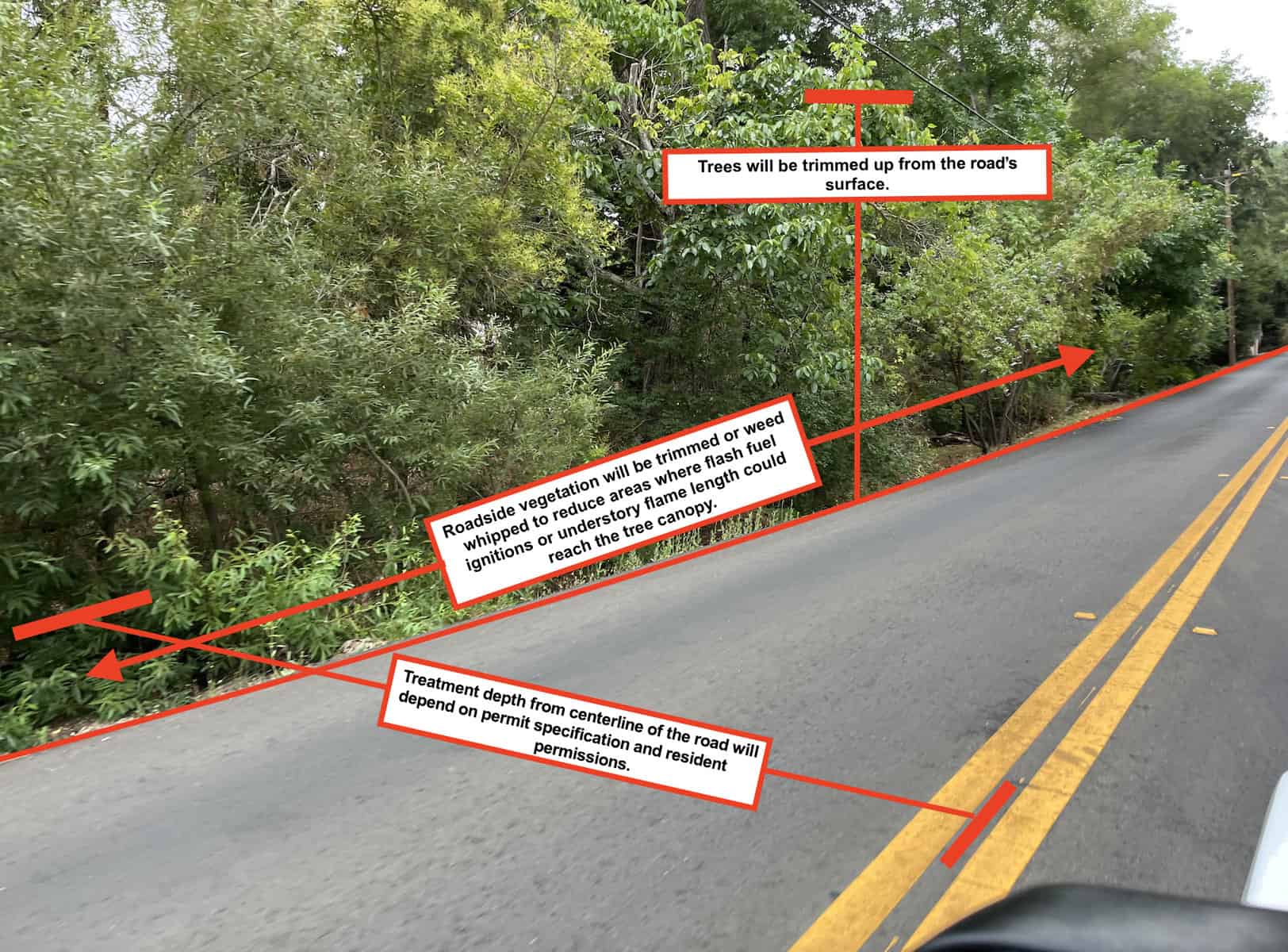 Trees will be trimmed up from the road’s surface. Roadside vegetation will be trimmed or weed whipped to reduce areas where flash fuel ignitions or understory flame length could reach the tree canopy. Treatment depth from the centerline of the road will depend on permit specification and resident permissions.